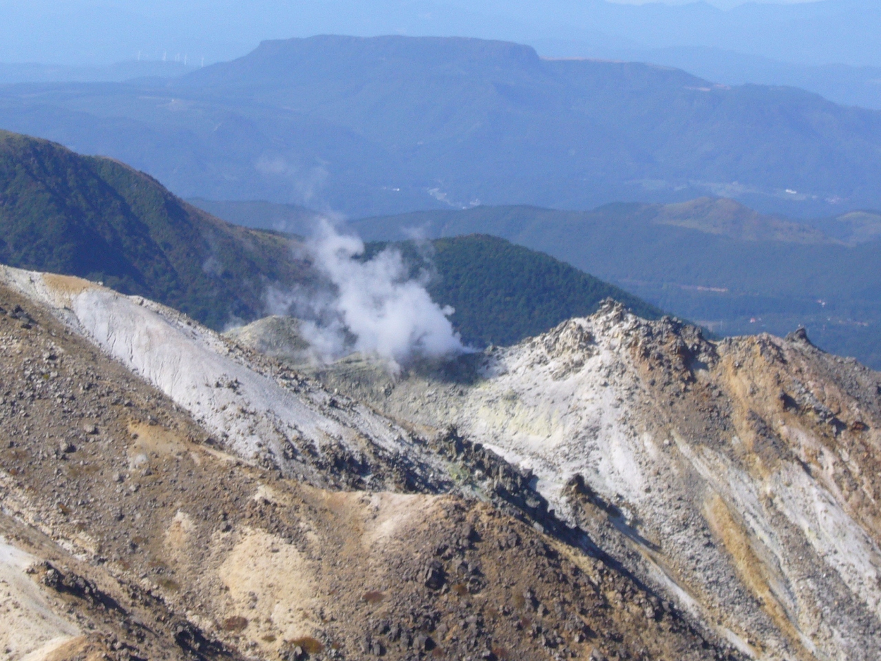 - 南面はくじゅう中央山群の景色、北面は噴煙を上げる硫黄山へと続く荒々しい火山の姿です。