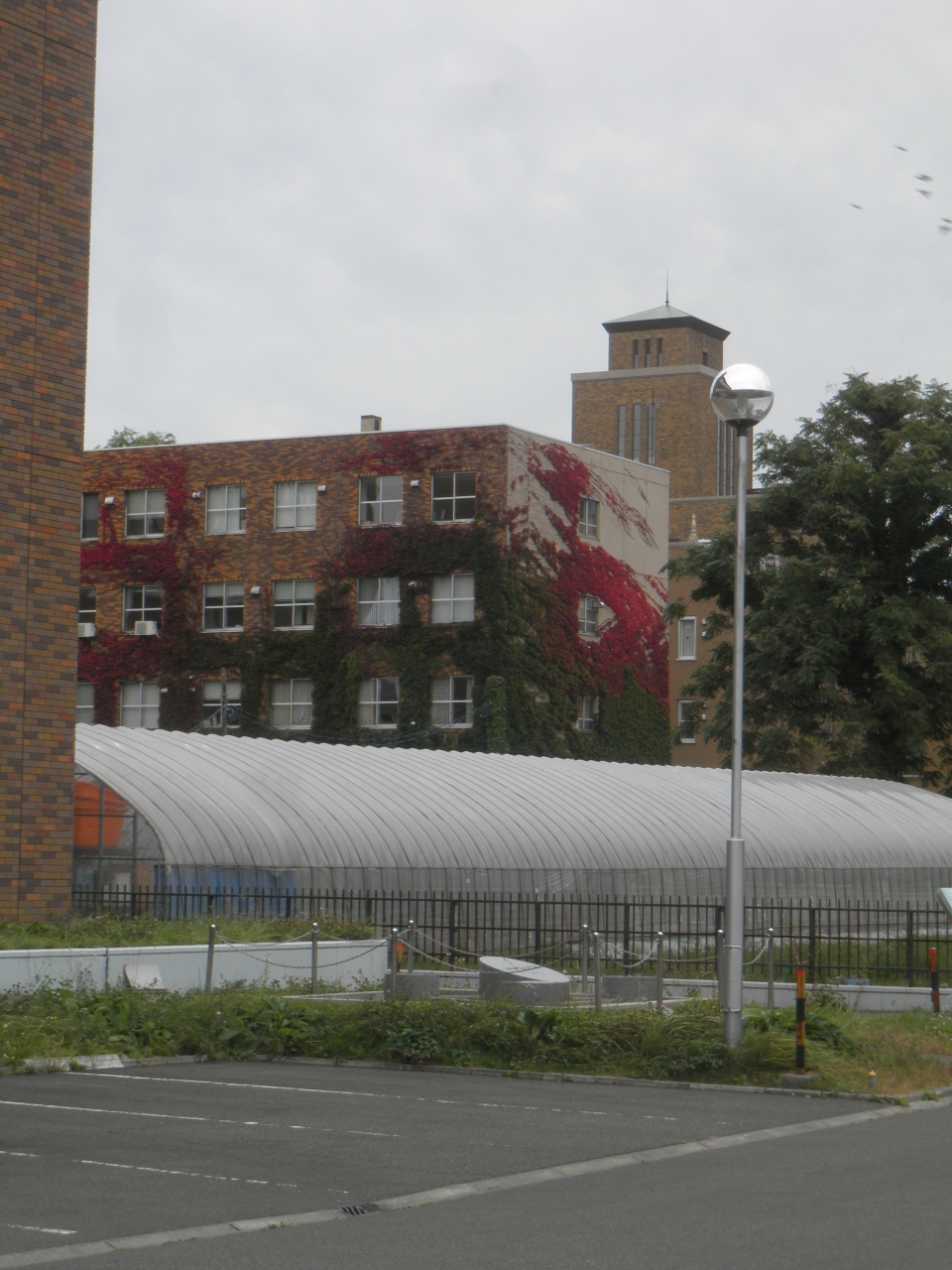 10月上旬に札幌の北海道大学のキャンパスを散策しました。 自然が豊かな敷地で、秋の気配を感じるのに、農学部の裏から、ポプラ並木までの昔の引き込み線路があった長い道をあるきました。 ポプラ並木の手前には、小麦研究記念碑 があって、建物のつたが紅葉してきれいでした。