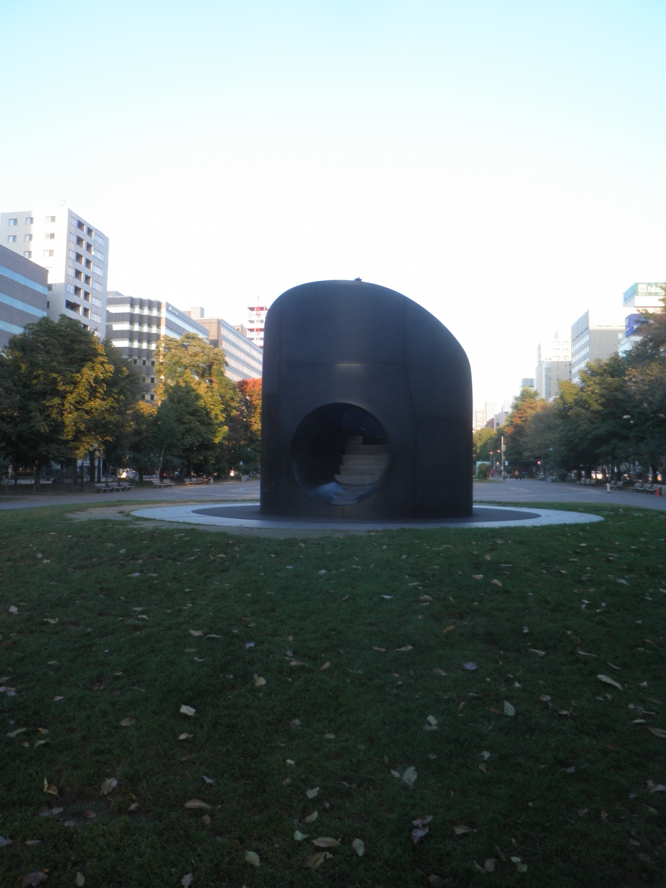 札幌の大通公園にあるイサムノグチ作の真っ黒い滑り台です。 もう寒くなって子供がすくないせいか、大人もけっこう滑るようです。 きめの細かい石でできているので、肌触りがいいけどけっこう冷えます。 周りの木々が紅葉して、秋の風情です。
