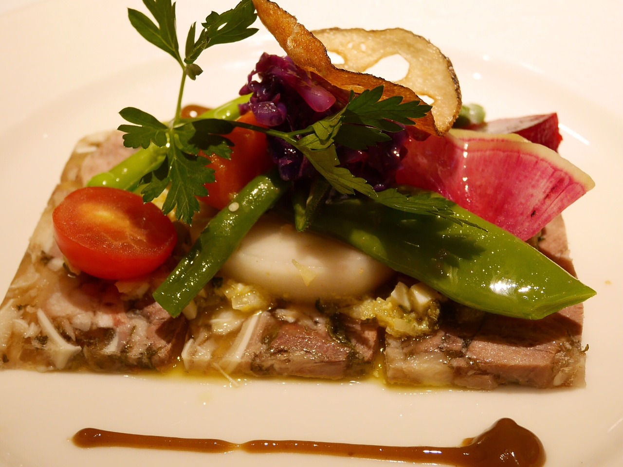 豚肉のパテは臭みもなく、色とりどりの野菜がたくさん添えてあり、見た目にも美しい一品。酸味の効いたドレッシングとも相性バッチリです。
