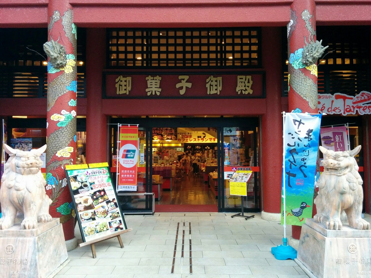 近づいて良く見ると、正面出入口の上の軒先に『御菓子御殿』の店名が・・・