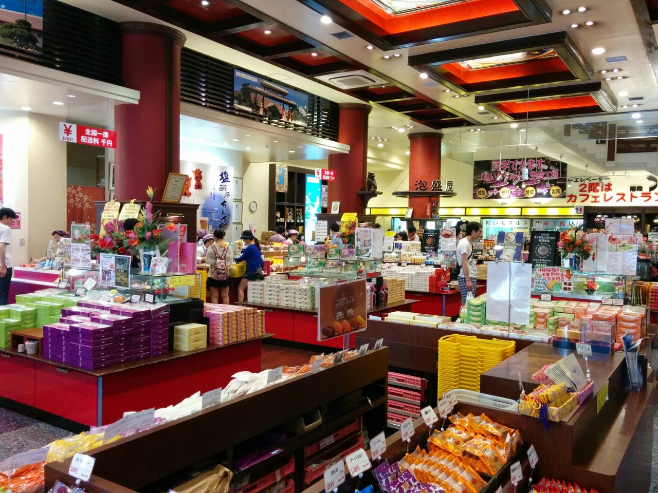 お店の1階は、たくさん種類の沖縄特産の「紅いもタルト」や「ちんすぅこ」などがあり試食できて買い物できるのが良かった。