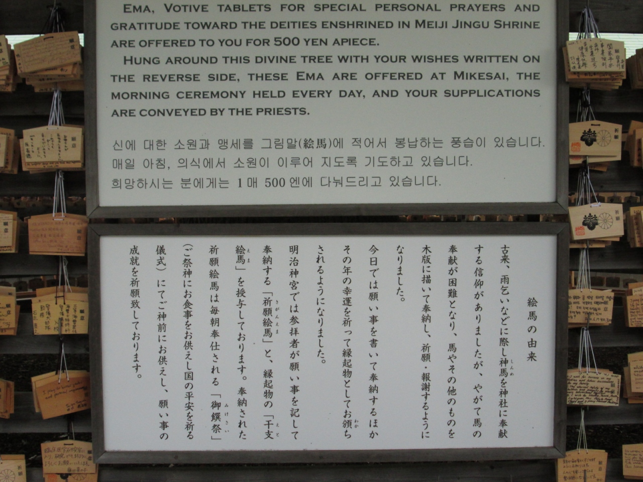 大きな楠の下に、大勢の外国人観光客の方々が集まっていました。楠の下の絵馬を見ているんですね。外国の方には珍しいのでしょう・・・一生懸命写真を撮影していた方もいました。説明看板には、英語も書かれてあり、国際的な「絵馬」になっているようです。