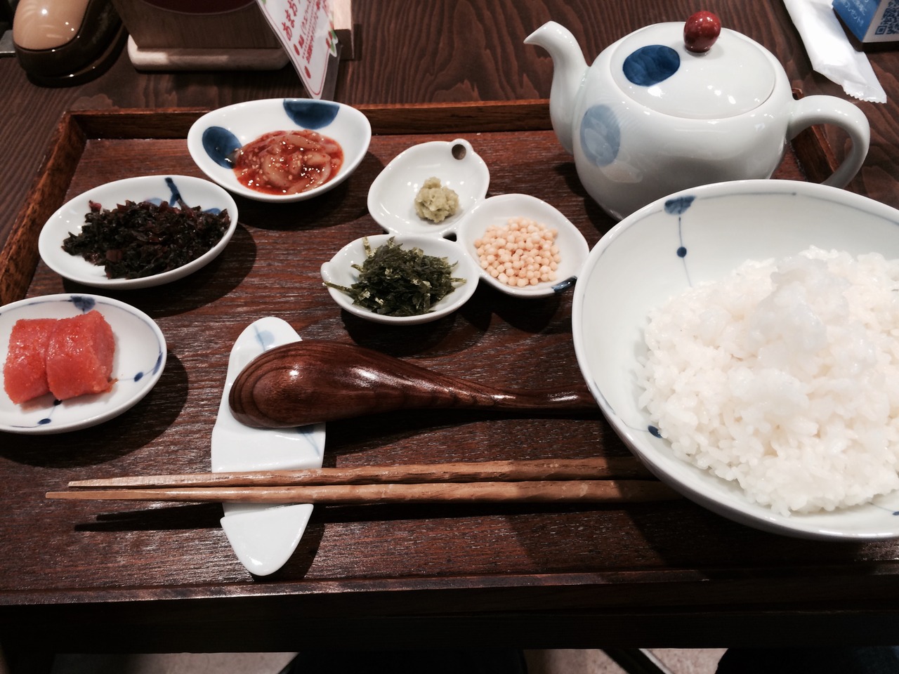 大宰府の参道沿いにある明太子のお店の中で10席ほどのスペースで明太子、イカの塩辛、梅の漬物のお茶漬けを食べることができます。値段はおおよそ800円で、ご飯と出し汁のお代わりが無料です。