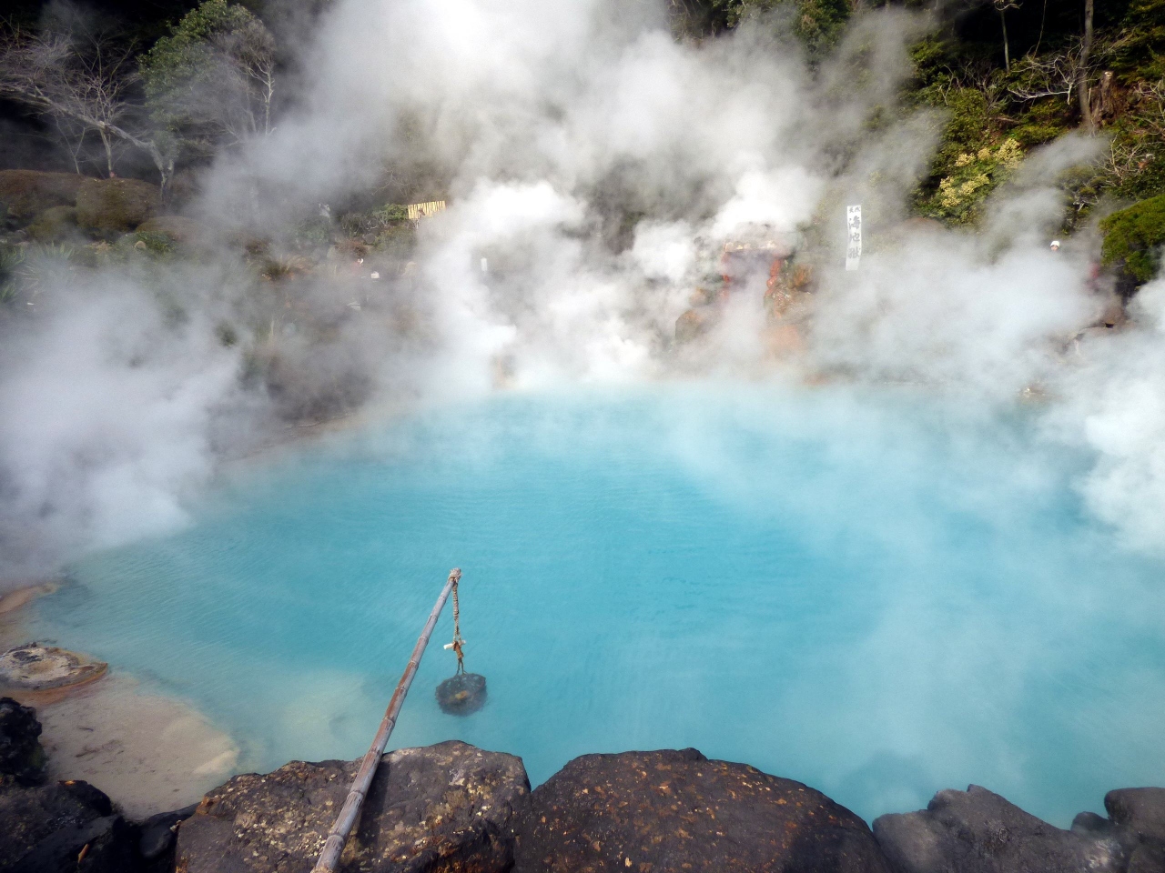 海地獄は、98℃もあるコバルトブルーの地獄から吹き上がる噴気が大迫力です。