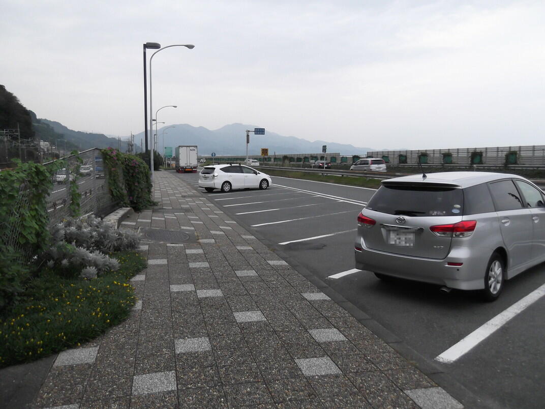 海側から、駿河湾、東名高速道路、パーキングエリア、一般道、東海道本線と山の配列になります。平地部分が少ないので、PAは横に長く進入路を使ってバックで斜め駐車することになります。初心者の方は 辛そうです。時間をかけると進入してきた車が渋滞するので。