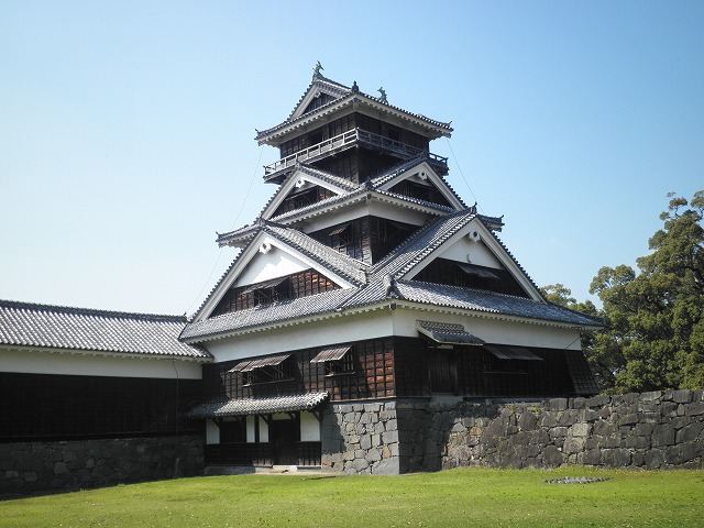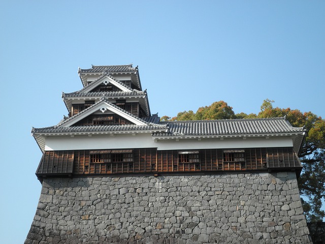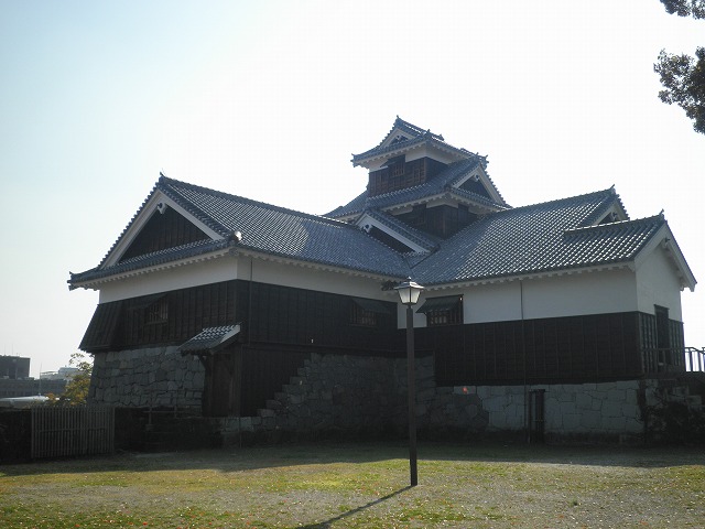 次いで「飯田丸五階櫓」。こちらは木造で復元されています。規模は宇土櫓ほどはありませんが、こちらも勇壮な石垣の上に築かれた、どっしりとした重量感のある建物です。見学コースからはやや外れ気味ですが、お城ファンなら、見逃せません(内部も見学できます)。