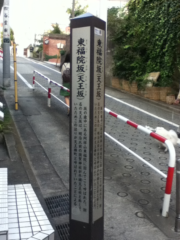 地下鉄四谷三丁目駅の南東、新宿通りの南にある区立四谷小学校の西側の路地を南西に進むと、右側に東福院がある。この前の坂が東福院坂 (天王坂)である。やや急な坂で、路面には滑りにくように〇の溝がきってある。坂自体には観光要素は少ないが、周辺に東福院と愛染院等の観光施設があるので、併せて訪問することをお勧めする。