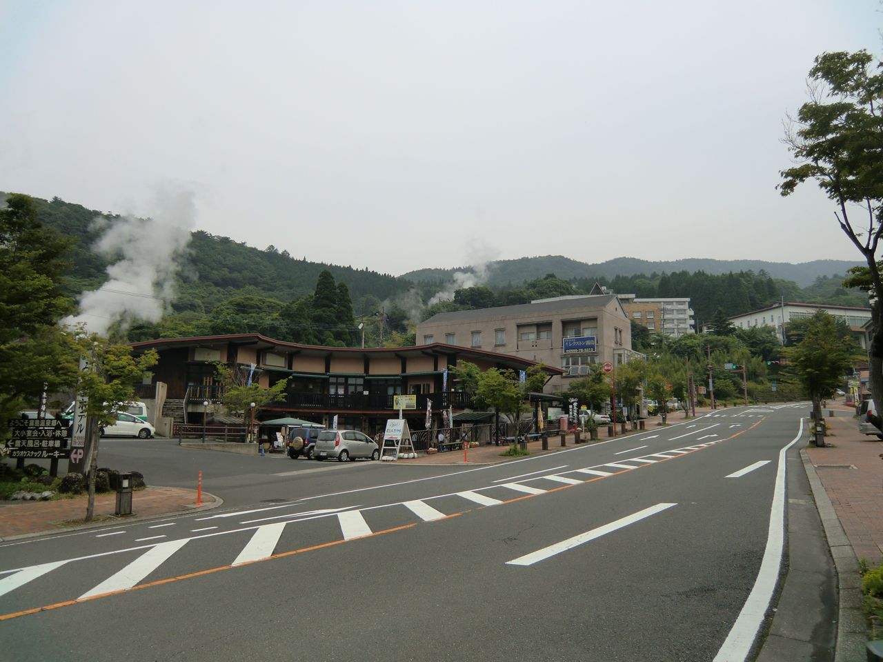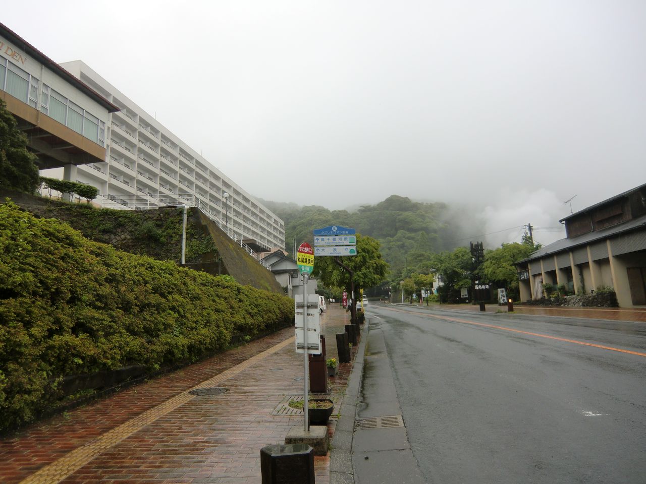 丸尾温泉。10軒以上の大型ホテルがあり、丸尾温泉のバス停のまわりが一番の中心地です。観光案愛所「温泉市場」もあります。