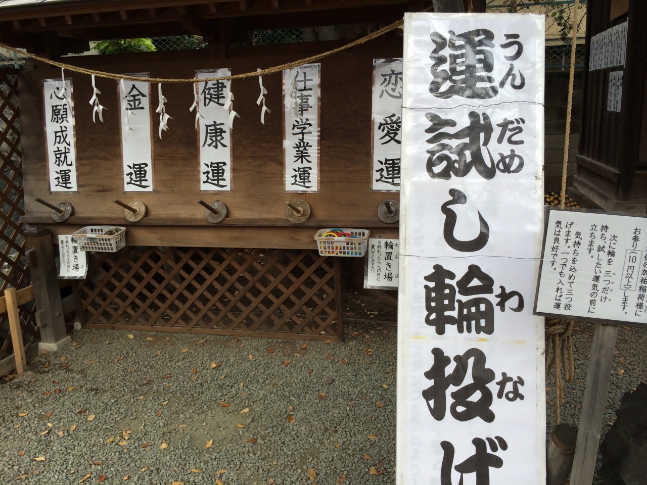 輪投げはお稲荷様にお賽銭を10円以上あげてから三つの輪投げを持って試したい運気(金運、健康運・・)の的の前に立って輪を投げ、一つでも入れば運気は良いとされます。 ゲームセンターみたいな神社です。