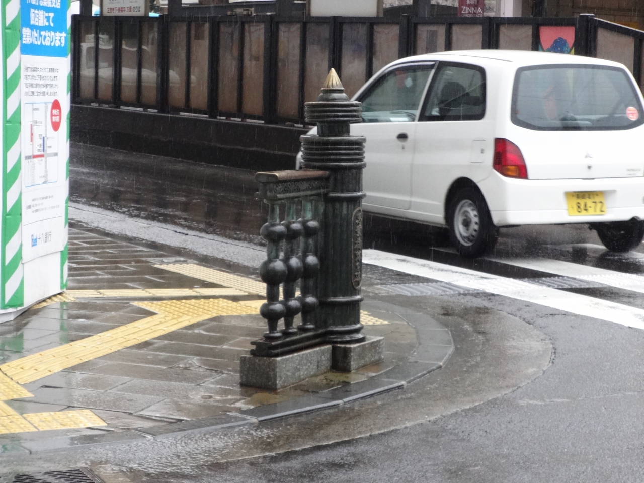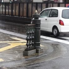路面電車の思案橋電停の道路を挟んだ両側に橋の欄干を模した思案橋跡の碑が建てられています。