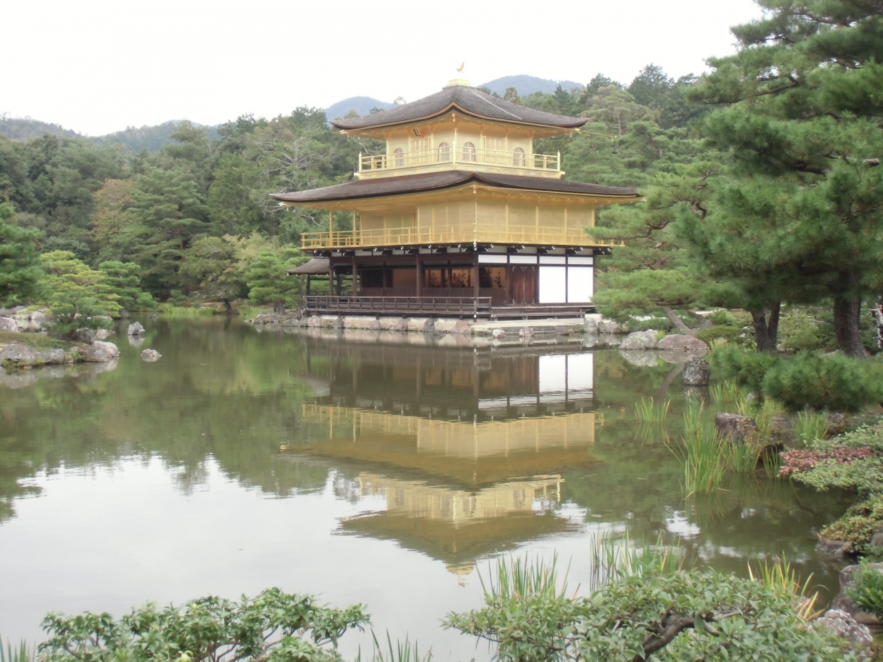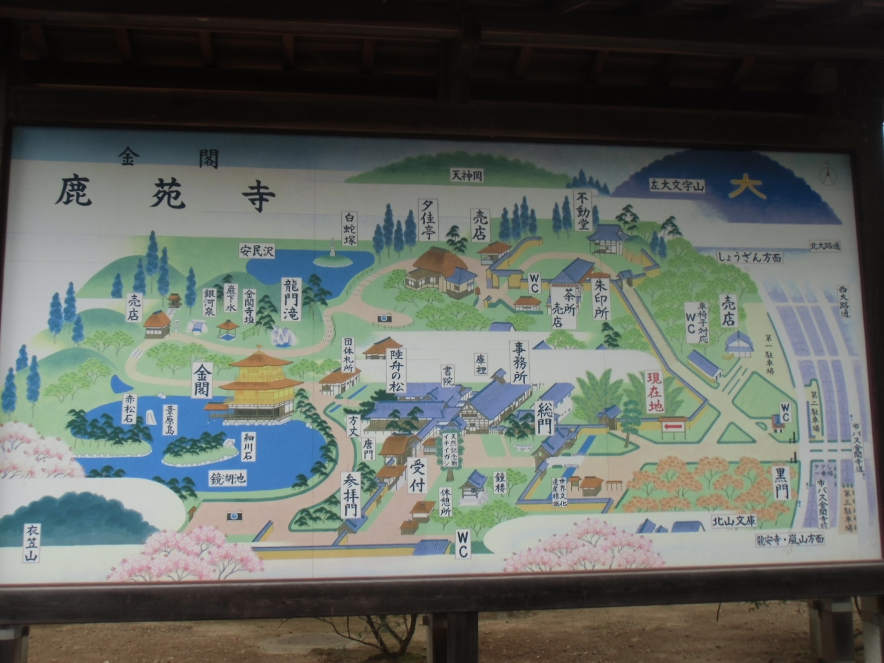 JR京都駅から京都市バス101番か205番(市内均一区間230円)で約40分、金閣寺道下車、徒歩5分です。バスは約5分間隔で出ていますが、連休や紅葉の時期は大渋滞のため1時間以上かかることもあります。金閣寺は世界遺産で、斜利殿(金閣)はとても有名ですが、それ以外にも庭園など見どころもたくさんあります。