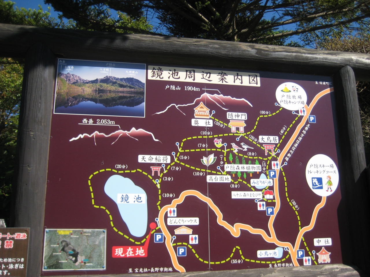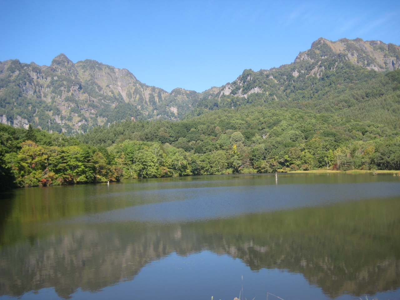戸隠神社奥社参拝後、随神門から戸隠森林植物園を散策しながら1時間ほど歩くと大きな鏡池に出てきます。ここは池に西岳や戸隠山など戸隠を囲む山々が逆さに映しだされ、言葉をのむ美しさでした。池の周りには芝生もあり、座って景色を楽しむ方々も多くみられました