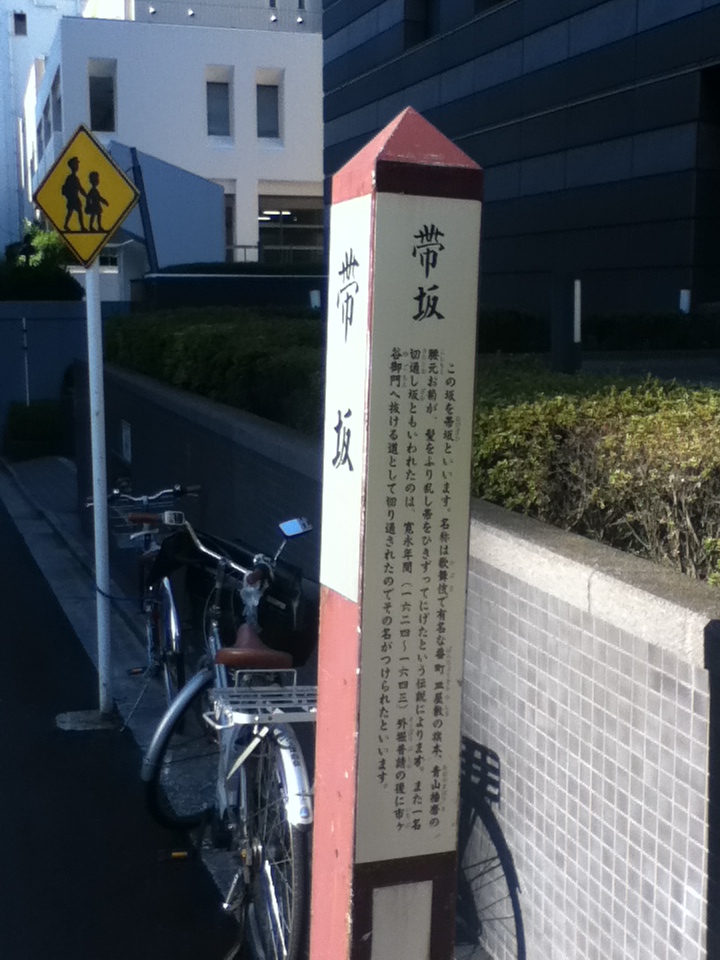 JR市ヶ谷駅のすぐ南、靖国通りとその1本南を走るやや細い道路との間にある坂。坂は緩やかで、ビルに囲まれ、途中には日本棋院の建物がある。坂自体には観光要素は少ないが、坂の名前が、怪談「番町皿屋敷」のお菊が髪を乱し帯をひきずりながら歩いたとの伝説が由来らしいことから、怪談に関心や知識がある方にとっては興味深い施設であり、また近くには東郷公園や靖国神社等の観光施設があることから、併せて訪問することをお勧めする。