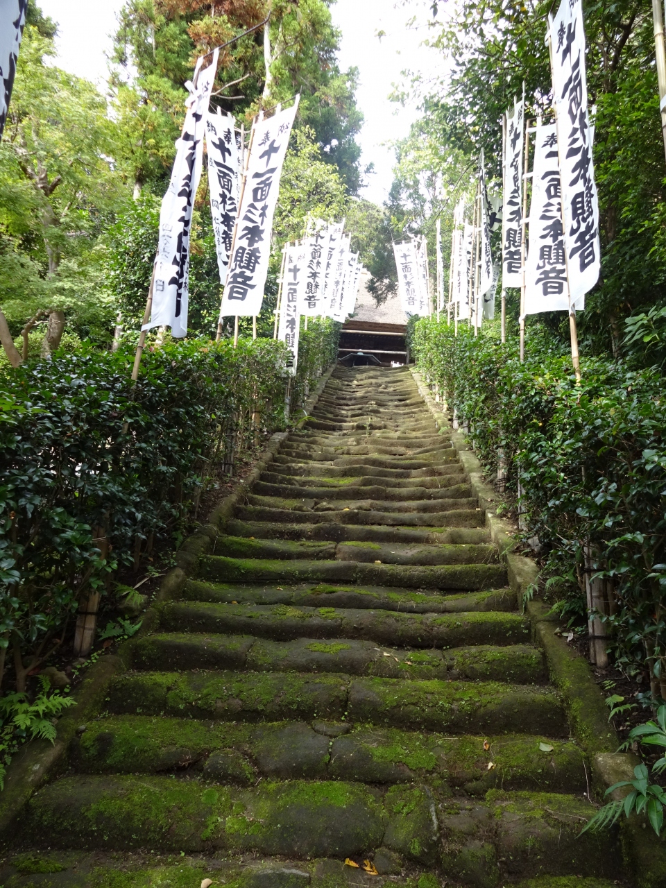 階段の両側から続く、白い奉納幟がいい味を出していて、