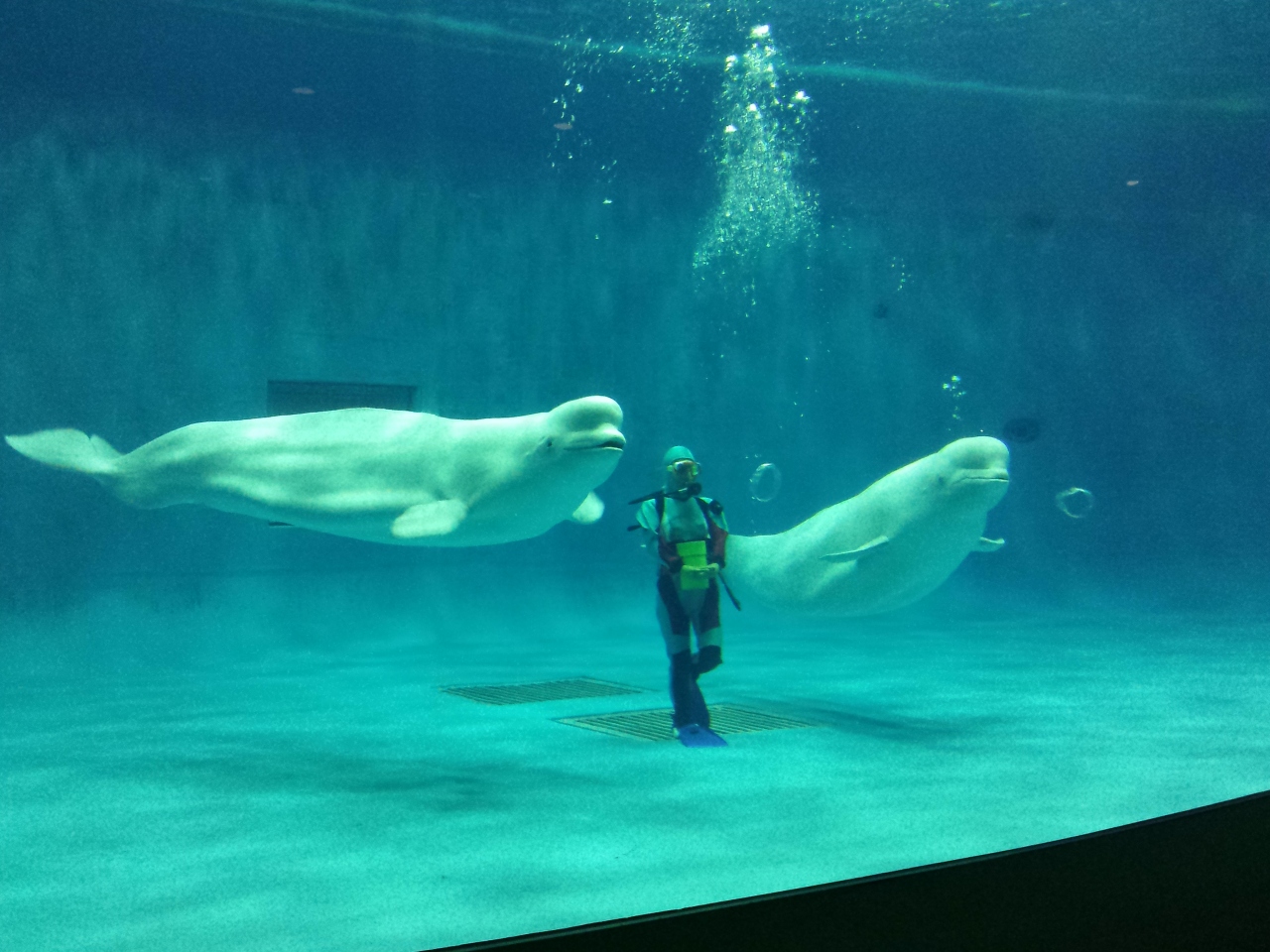 シロイルカによる幸せのバブルリング&マジックリングはお勧めです。パフォーマンス中はお客さんが多くて近くに寄れませんが、終了後には近くでシロイルカを見ることができます。