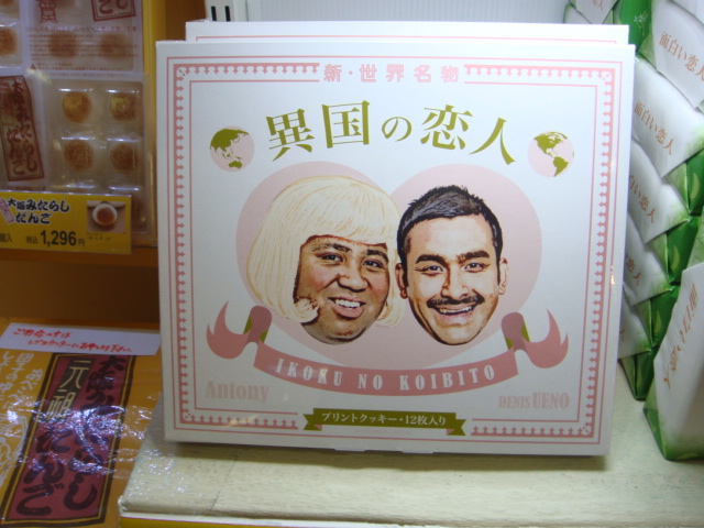 北海道の銘菓「白い恋人」のパロディー版、ハーフ芸人のデニス植野とマテンロウ・アントニーがプリントされたクッキー「異国の恋人」が販売していました。クッキー12枚入りで、価格は700円、また「デニス植野 学習帳」「アントニー 学習帳」なるものも売っているようです。さすがによしもとは時流に乗るのと金儲けがうまい!