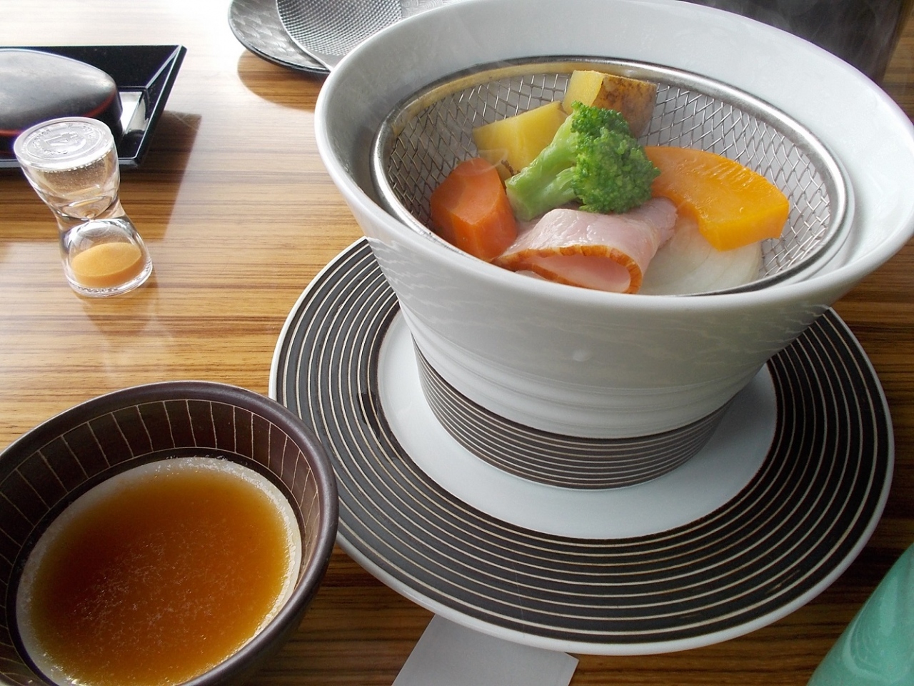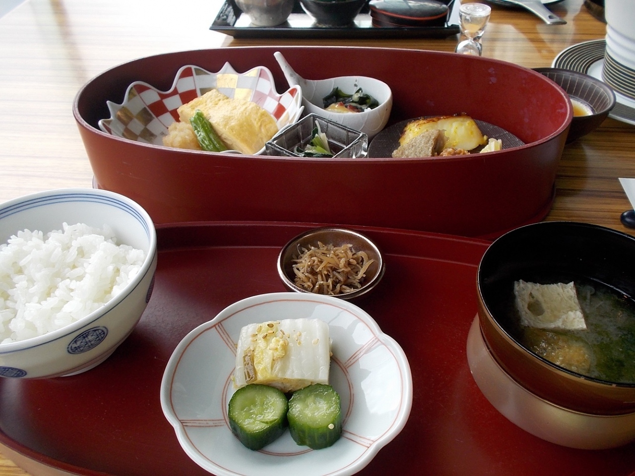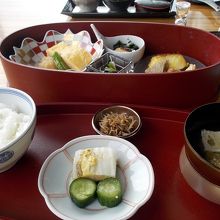 内容は、手作り豆腐、蒸し野菜が運ばれてきて、お膳へと続きます。柔らかい甘味の感じる豆腐で、餡をかけていただきました。焼き魚、卵焼きなどもとても上品に丁寧に作られており朝から贅沢な朝食でした。