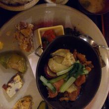 なすびやれんこんなどいろんな野菜をつかったおばんざいと、メインに鶏肉の煮込んだものが真中にのった大皿のプレートでした。