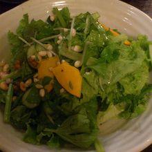 みどりの野菜が多かったです。セロリ、水菜、豆類などがはいっていてドレッシングがおいしかったです。