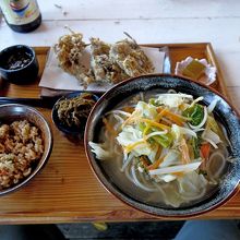 6年前に来たことがあり,その時の野菜そばともずくのてんぷらなどが忘れられなく,今回の職員旅行の昼食先をここにした.ほかにも沖縄すば淡水などもあるが,周りの雰囲気もあり,観光客向きはここだ.やっぱりおいしかった.暑い夏の日,海沿いの木陰で,もずくを食べながらビール!最高だよね!!