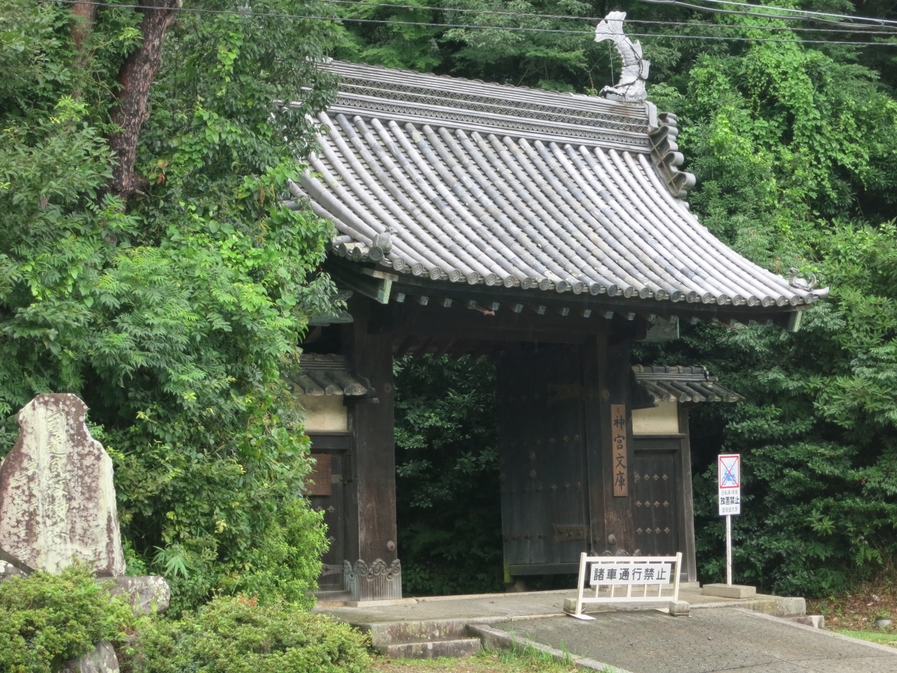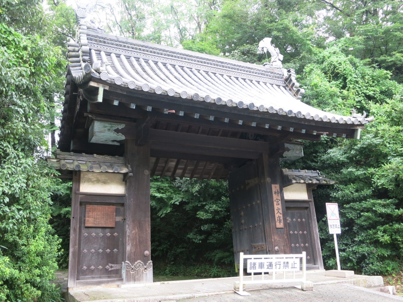 門の奥は神宮文庫に続く石段となっていますが、雨が降ると滑り易い石なので注意が必要。ちなみに神宮文庫は工事中で立ち入り禁止でした。