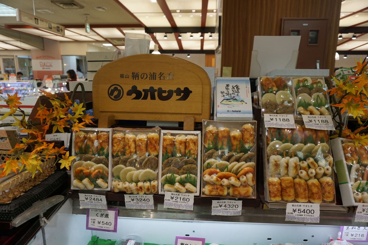 鞆の浦には蒲鉾屋さんがいくつかあるのですが、何故か、市街中心部にはなくてけっこう不便。ウオヒサも鞆の浦の中心部からは少し距離があって、安国寺下まで歩いたところで断念。しかし、聞くと天満屋の地下にもお店があるよということで、そちらを訪ねることにしました。