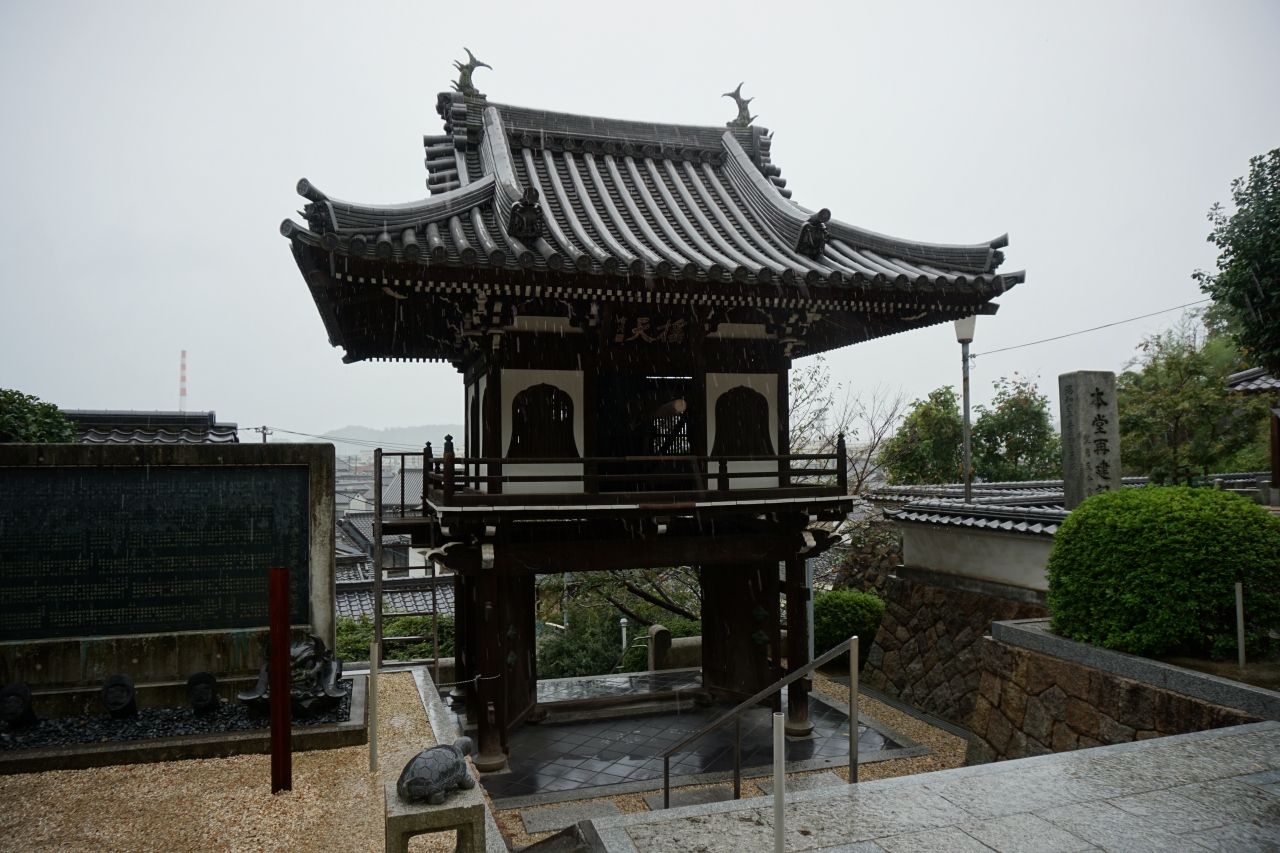 天正15年(1587年)、秀吉の四国攻めの中で、小早川氏に降伏し竹原にいた伊予水軍最後の当主、河野通直が病没したのを悼み、小早川隆景が建立しました。石段を登った先の楼門が立派で見応えがあります。奥には、ここにもお抱え地蔵がありました。