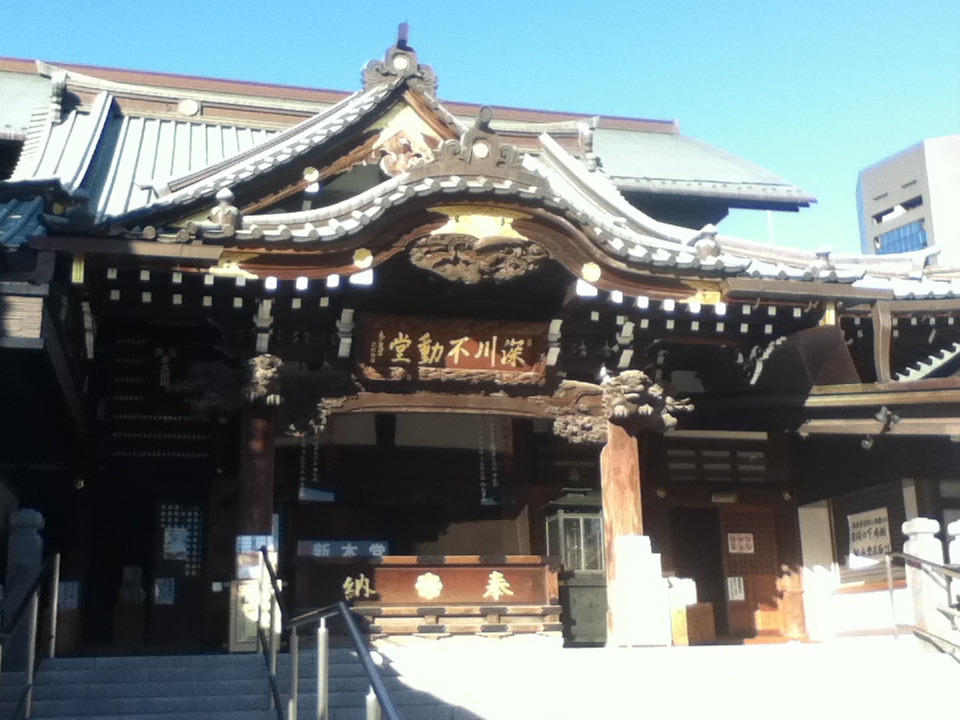 地下鉄門前仲町駅の東側出口の西側には、不動尊に通じる参道がある。参道をまっすぐ進むと、昔は突き当りが本堂であったが、最近、左側に新しい本堂が建てられていた。深川不動堂は、成田市の成田山新勝寺の東京別院であり、明治以来「深川のお不動様」として、地元の人はじめ多くの人から敬拝され、正月や縁日の時は沢山の参拝者で大変賑わう。また参道には、昔から和食のレストランや雑貨等のお店が並び、最近は立飲み屋もできており、参拝の後、これらのお店で食事もできることから、特に成田山新勝寺やこの界隈に関心や知識のある方には興味深い施設であり、訪問することをお勧めする。
