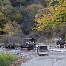 湯元源泉地は、湯元温泉街の北にあります。葦の茂湿原に木道が設置されており源泉地を周遊できます。小屋掛けの温泉井戸が並んでいて、中から湯けむりが立ち込めています。硫黄の匂いもかなり強いです。木道のすぐ脇からも温泉が湧き出しています。白濁とした水たまりに触れてみましたが生温かったです。