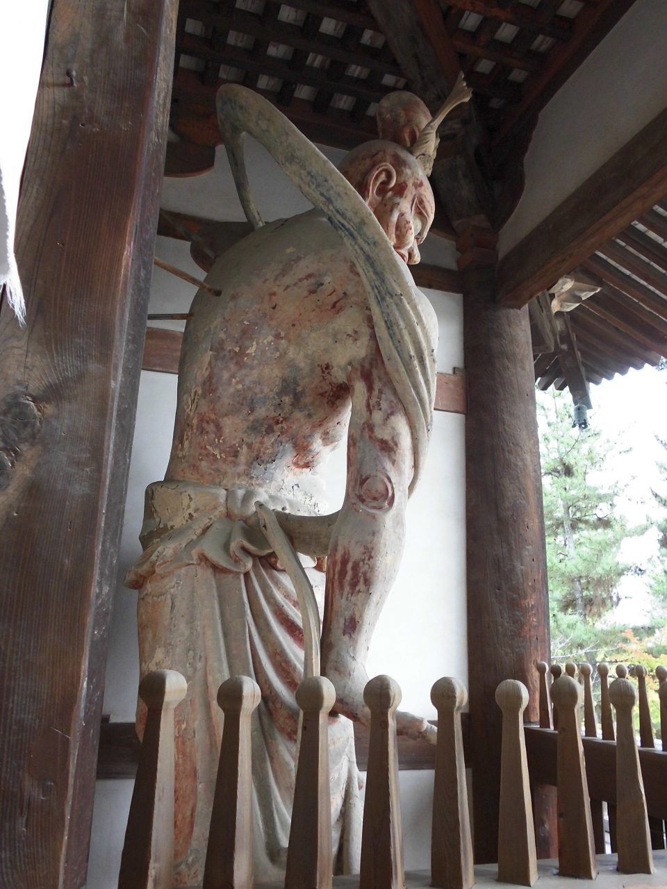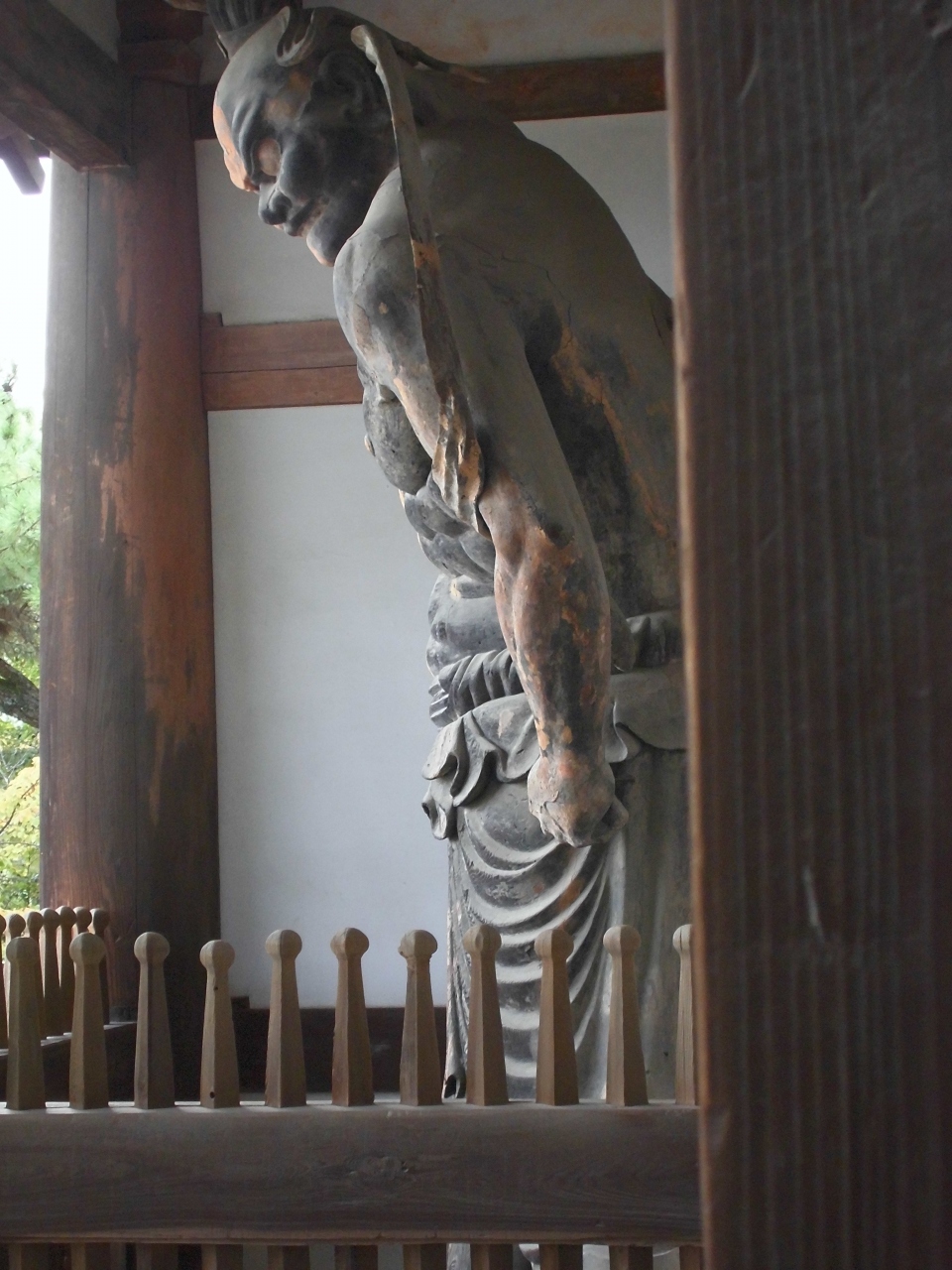 東大寺南大門の金剛力士像とは趣が異なり、腰を大きく横に引き、金剛杵(こんごうしょ)という武器を持たない素手の力強さが、邪心を抱いて門をくぐろうとする者を一撃で吹き飛ばしてしまうような迫力で迫ってくる。