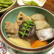 明太子入りの卵焼きや筑前煮(こちらではガメ煮と言います)、焼き魚、お刺身など博多の定番料理、鉄板メニューなど。