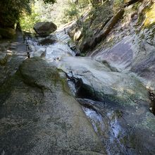 三郎のすべり滝は、府中町の県道から脇道を入ってしばらく行きますが、車ならほんの5分ほど。駐車場から渓流沿いの石段を上り始めると、いくつかの滝があって、一番奥にあるのがすべり滝。大きな石に出来た滑り台のように細い水路を水が勢いよく流れています。これなら、子供が滑り台のように滑っても危なくない。自然の力でできたものでしょうが、うまい具合になっています。