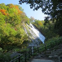 334号線の一本道を向かっているさなかにありました。駐車場はじゅうぶんにあり、れっきとした観光名所になっていました。階段を登るとすぐに滝の全貌が見えます。まわりの紅葉ときれいにマッチしていて綺麗な流れの滝でした。