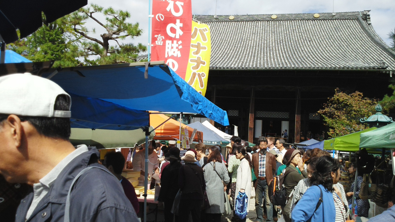 京都の百万遍という京都大学がある界わいにあるお寺で、おしゃれな手作りのものが多くクチコミで広がって、最近はすごい賑わいです。10月15日はいい天気で、人も多く暑い位でした。お堂にあがると一望でき爽快です。お堂の近くのコーヒー店は美味しくて、賑やかな中、ほっと休めます。
