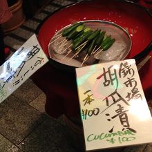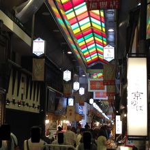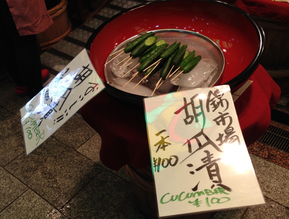 細い通路は国内外の観光客でいっぱい、京都の台所らしく、活気がありますね。歴史ある錦市場には、お茶屋さん、お菓子屋さん、漬物屋さんなど、京都の老舗が多く集まっています。左右を見ているだけで楽しくなります。試食でお腹がいっぱいになりましたが、漬物屋さんで、100円の串刺し胡瓜漬を購入、味も付いてミズミズしくて美味しかったですよ。
