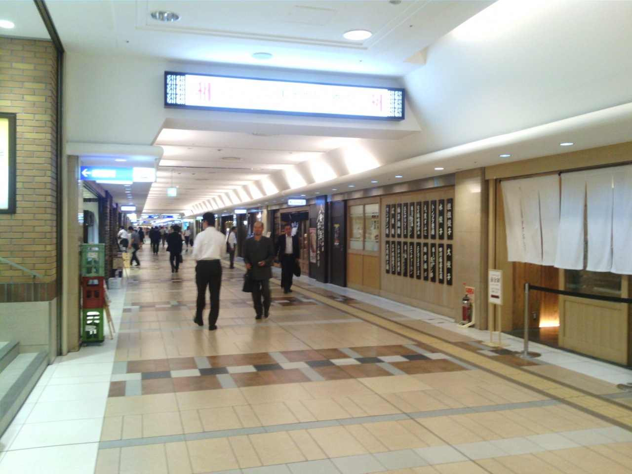 八重洲地下街は東に伸びる通路と南北に伸びる通路に沿った地下街です。色々な小売り店や飲食店があり、とても賑わっています。中心部から遠ざかってゆくと飲食店の値段も次第に安くなっていきます。どこにいるか判らなくなったら地上に出るとすぐに判ります。