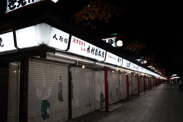 奥日光日帰りハイキングの帰りに仲見世通りに立ち寄りました。夜10時頃だったので、さすがに仲見世通り商店街はすべて閉店していましたが、逆に日中では見ることの出来ないシャッターの絵を見ることが出来ます。風情のある絵が沢山あります。