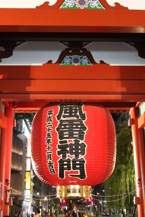 雷門は高さ3.9mの大きなちょうちんが吊り下がる浅草寺の総門です。表には風神・雷神像、裏には龍神像が安置されています。夜遅くにもかかわらず、雷門で記念撮影する方が絶えません。特に外人さんが多い感じでした。日本らしい風景なんでしょうね。