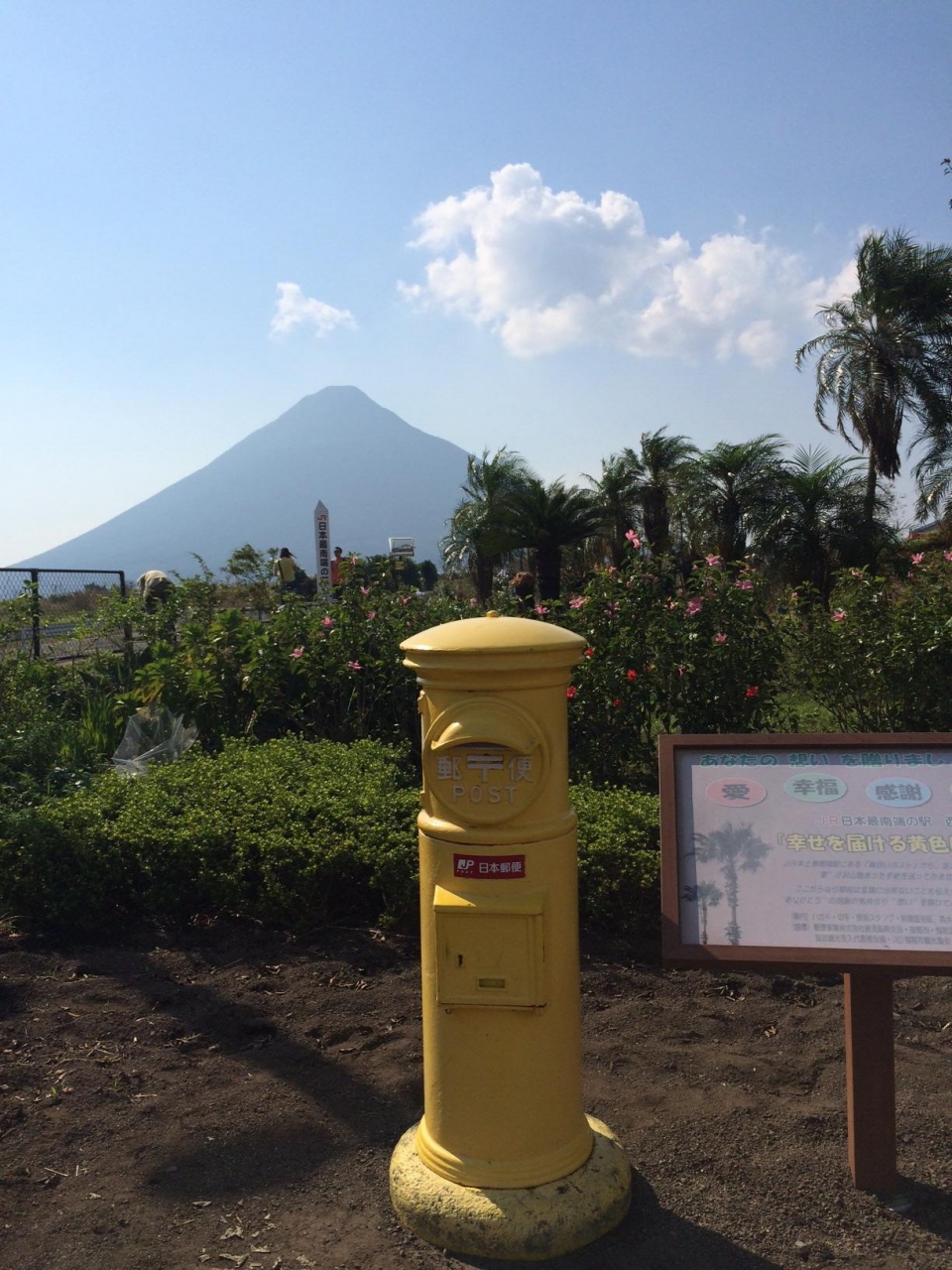 日本最南端のJR駅である西大山駅には幸せの黄色いポストもあります。駅には駐車場もあるのでレンタカーでも便利です。目の前には道の駅的な売店もあり、そこで切手つきの絵葉書が売ってあります。ちなみに駅は無人駅なので駅内でも気楽に景色を楽しめたり、写真撮影も楽しめます。