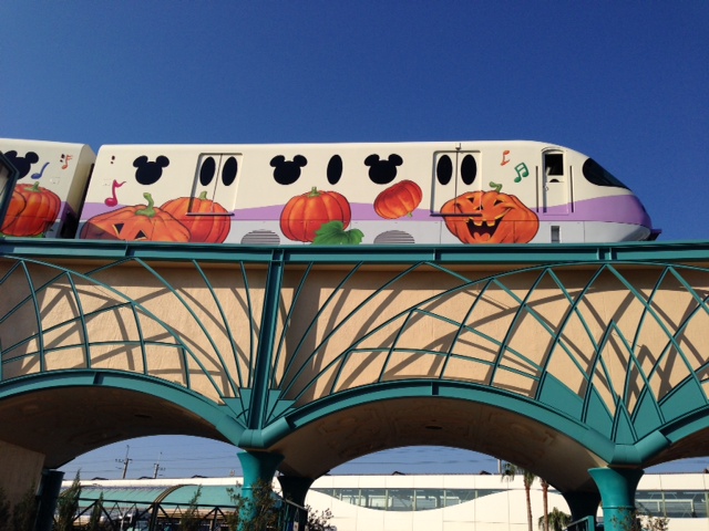 ハロウィーンバージョンのデイズニーリゾ−トラインが走っていますよ。地上から見ているとかぼちゃが空を走っているみたいです。いつもと違うリゾ−トラインにいろんな場所から見てみたくなります。クリスマスバージョンも走って欲しいですね。