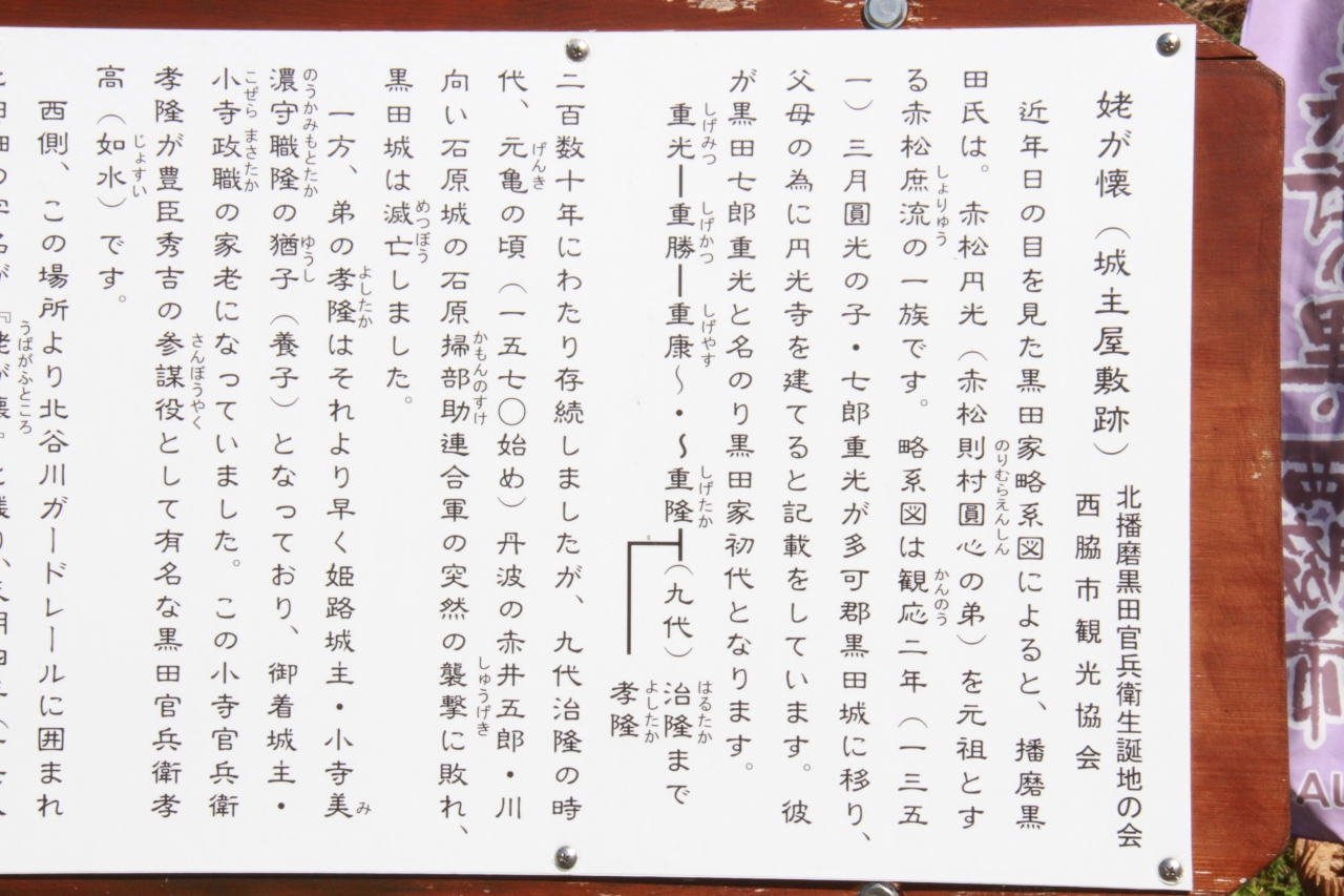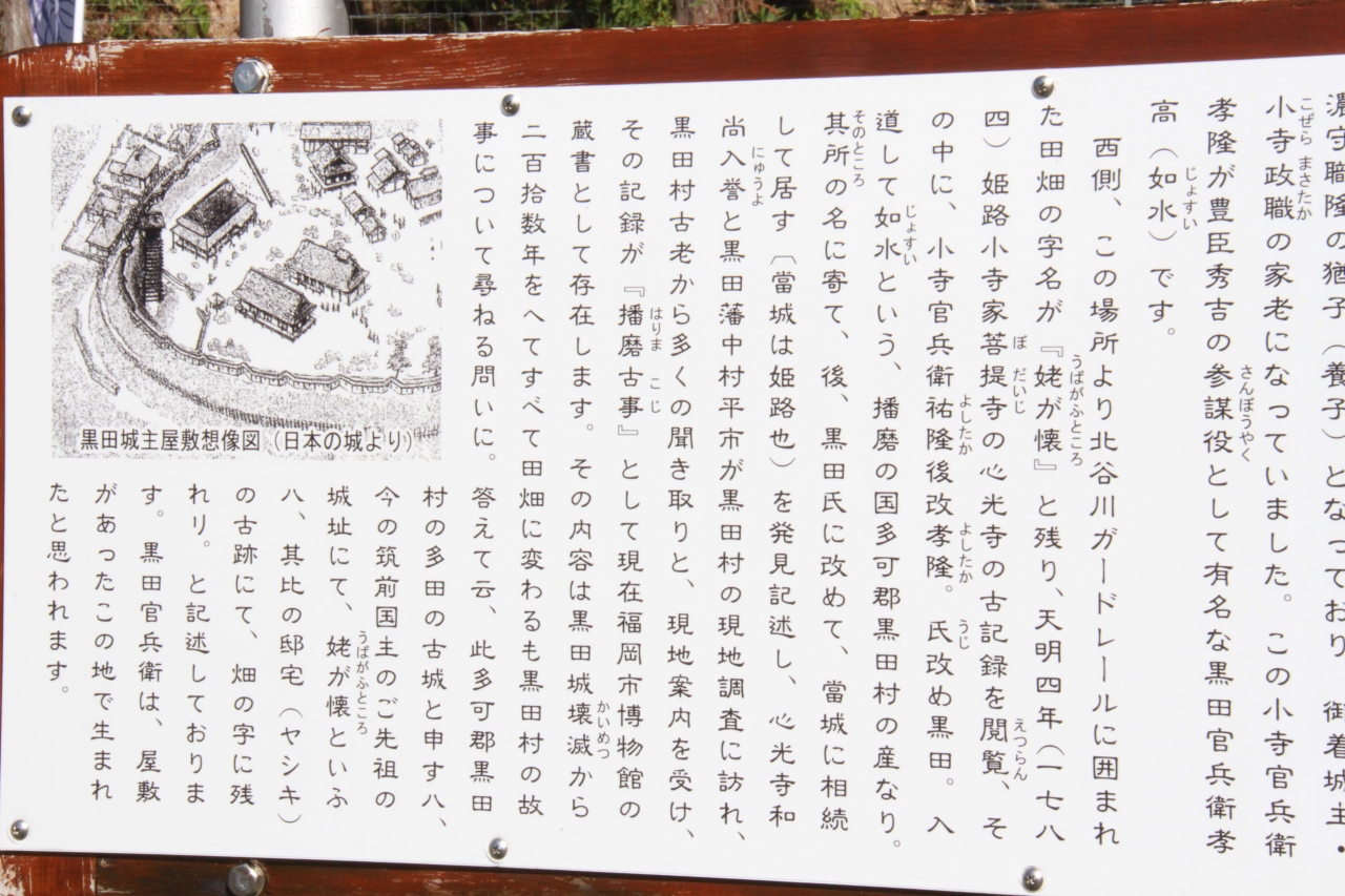 城山と黒田城下を流れる北谷川に囲まれた田畑の周辺が「姥が懐」と記されており、地元の有志によって、「黒田官兵衛生誕地」の石碑が建てられたそうです。
