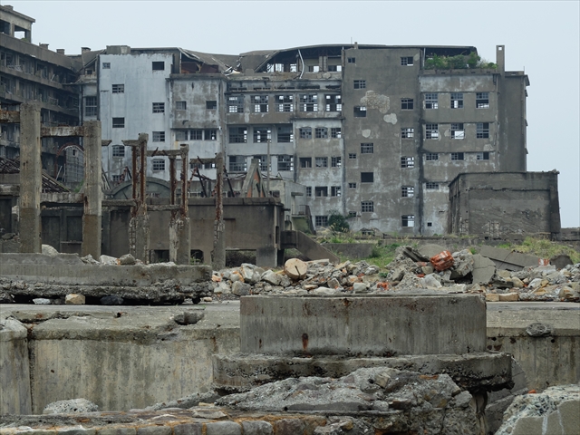 端島 (軍艦島)に残る町の廃虚は日々変化しているらしく、島の北端にある小中学校の屋根も最近落ちたばかり、などと言うガイドさんの説明がとてもリアル。