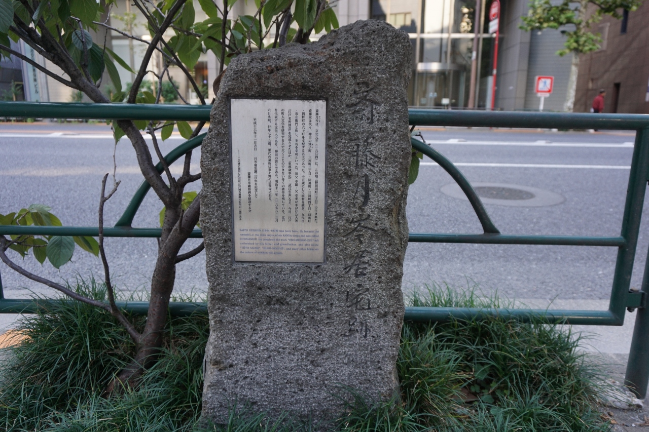 都会の歩道に小さな古びた石碑がポツンと建っていて、そのコントラスト自体が面白いです。斎藤月岑居宅跡と刻まれていますが、この斎藤月岑とは、祖父幸雄、父幸孝が手がけた大書「江戸名所図会」を完成させた人物。斎藤家はこの辺りの名主だったそうです。それにしても、東京の観光地を語る際には避けて通れない名著。素晴らしい功績と言えるでしょう。