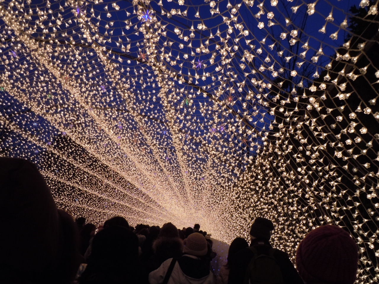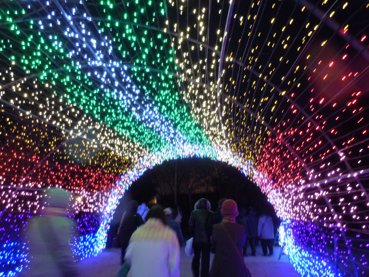 光のトンネルや虹のトンネルなどを通って行列になって歩くと、明るいときの園内とは別の世界に来たようでした。