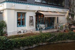 テラス席のすぐ脇を高瀬川が流れていて、その向こうには桜並木があります。