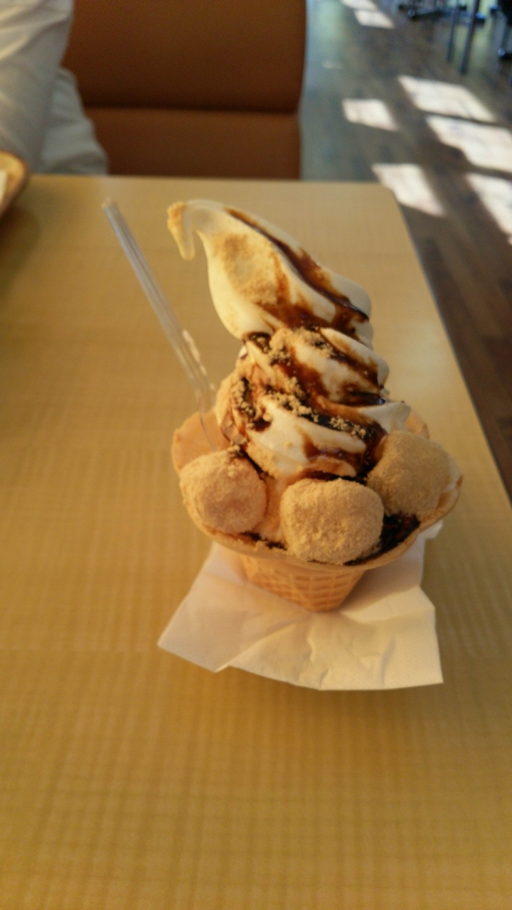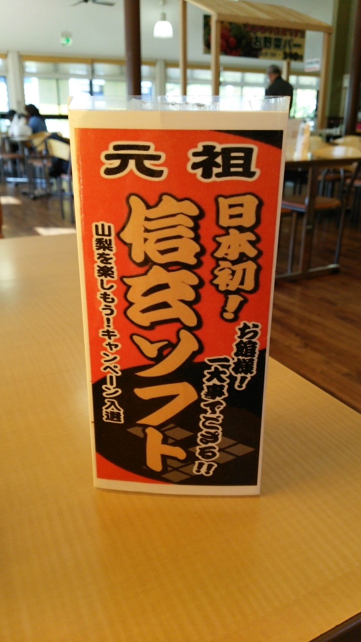 秋晴れの中,清里から甲府へ移動中に立ち寄りました。食堂で見つけたのは元祖日本初!信玄ソフトと名打ったソフトクリームでとても美味しかったです。信玄餅とソフトのコラボで甘さと美味さがミックスされた感じです。食後のデザートとしては最高でした。