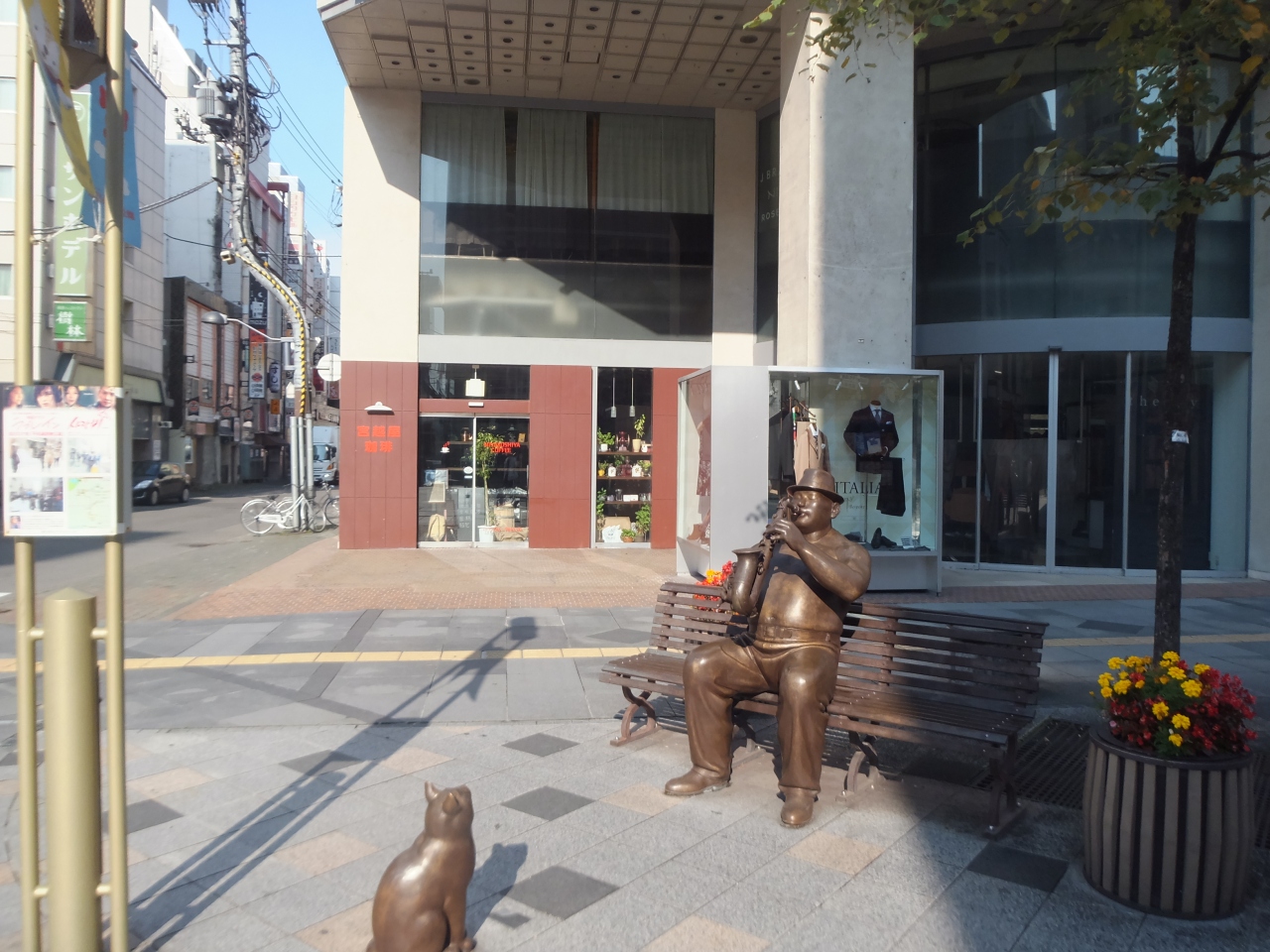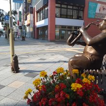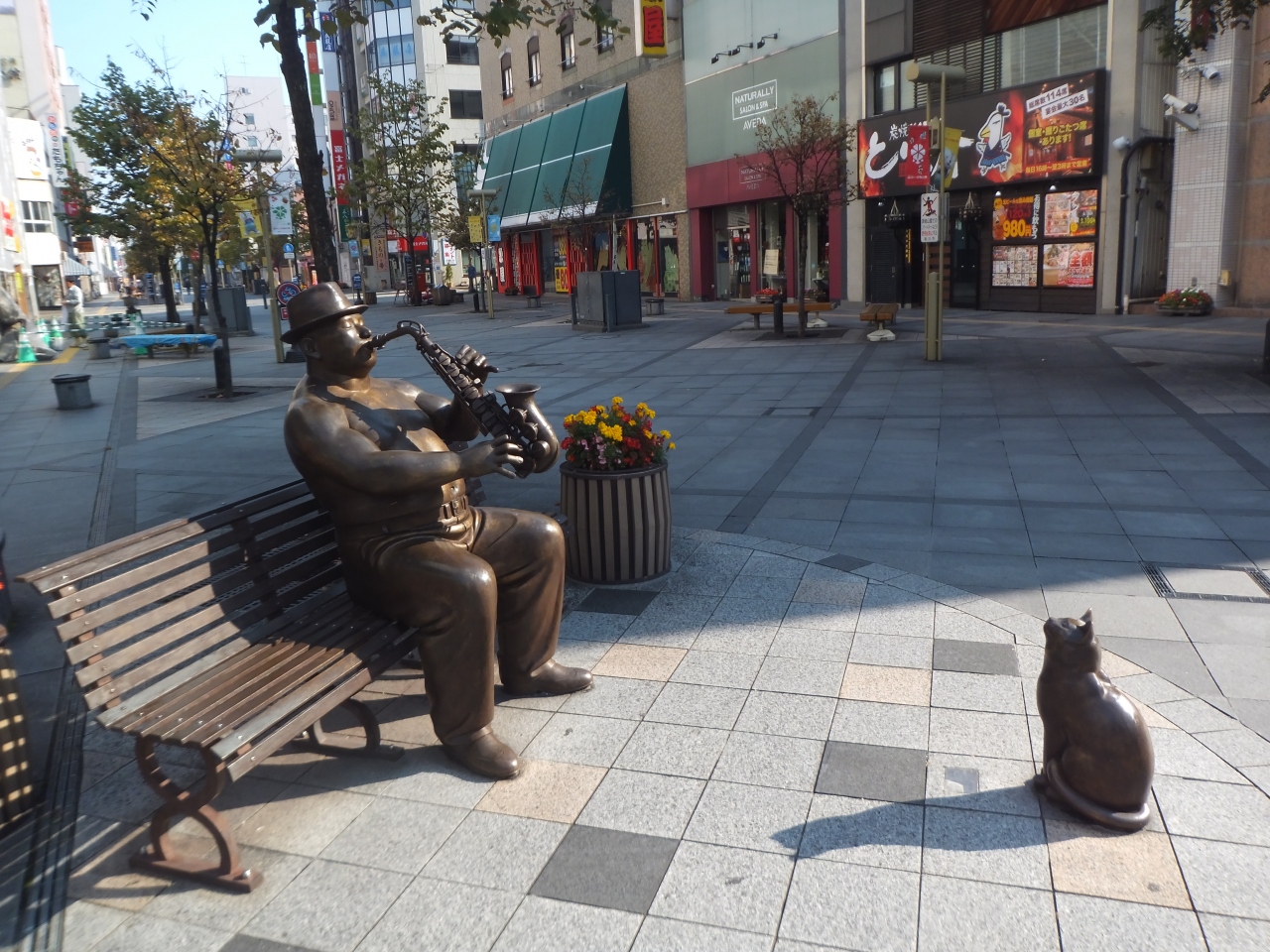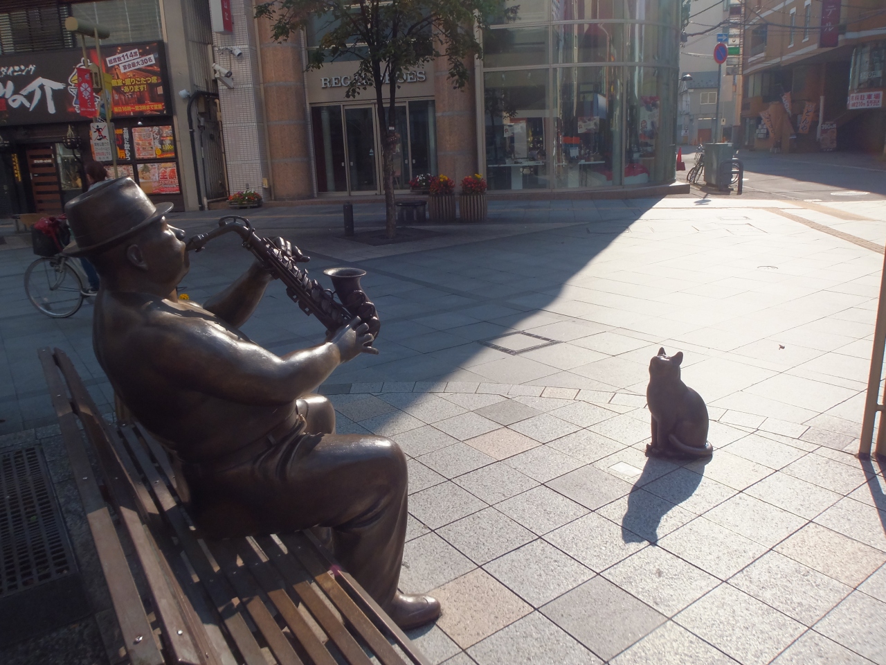 ベンチに座ってサキソフォンを吹く男の様子を猫が見ているという銅像で、一緒にベンチに座って記念撮影をすると、愛嬌のある写真になるかと思います。そういう意味では、体験型の彫刻です。
