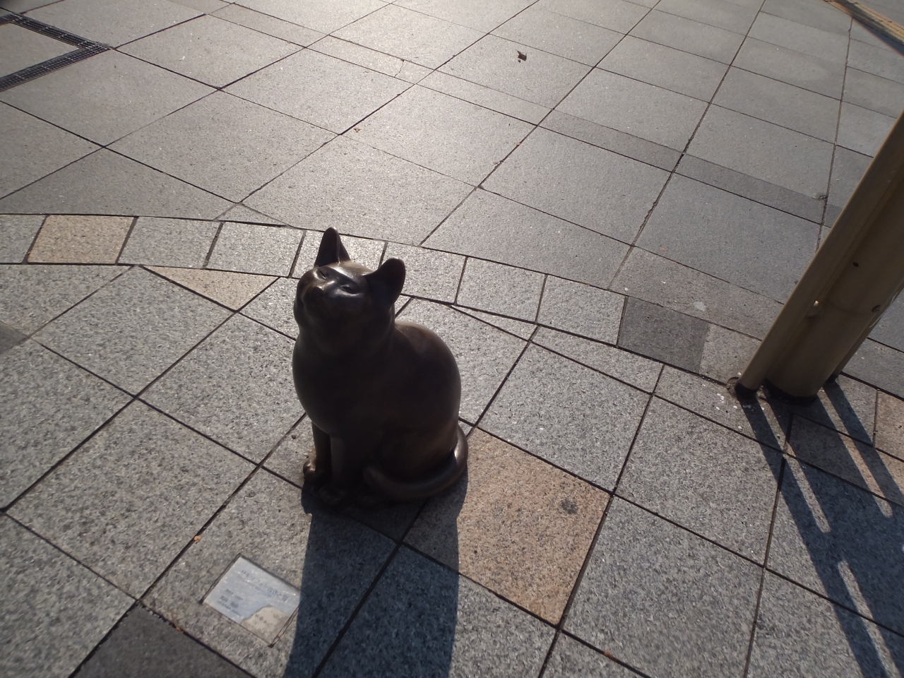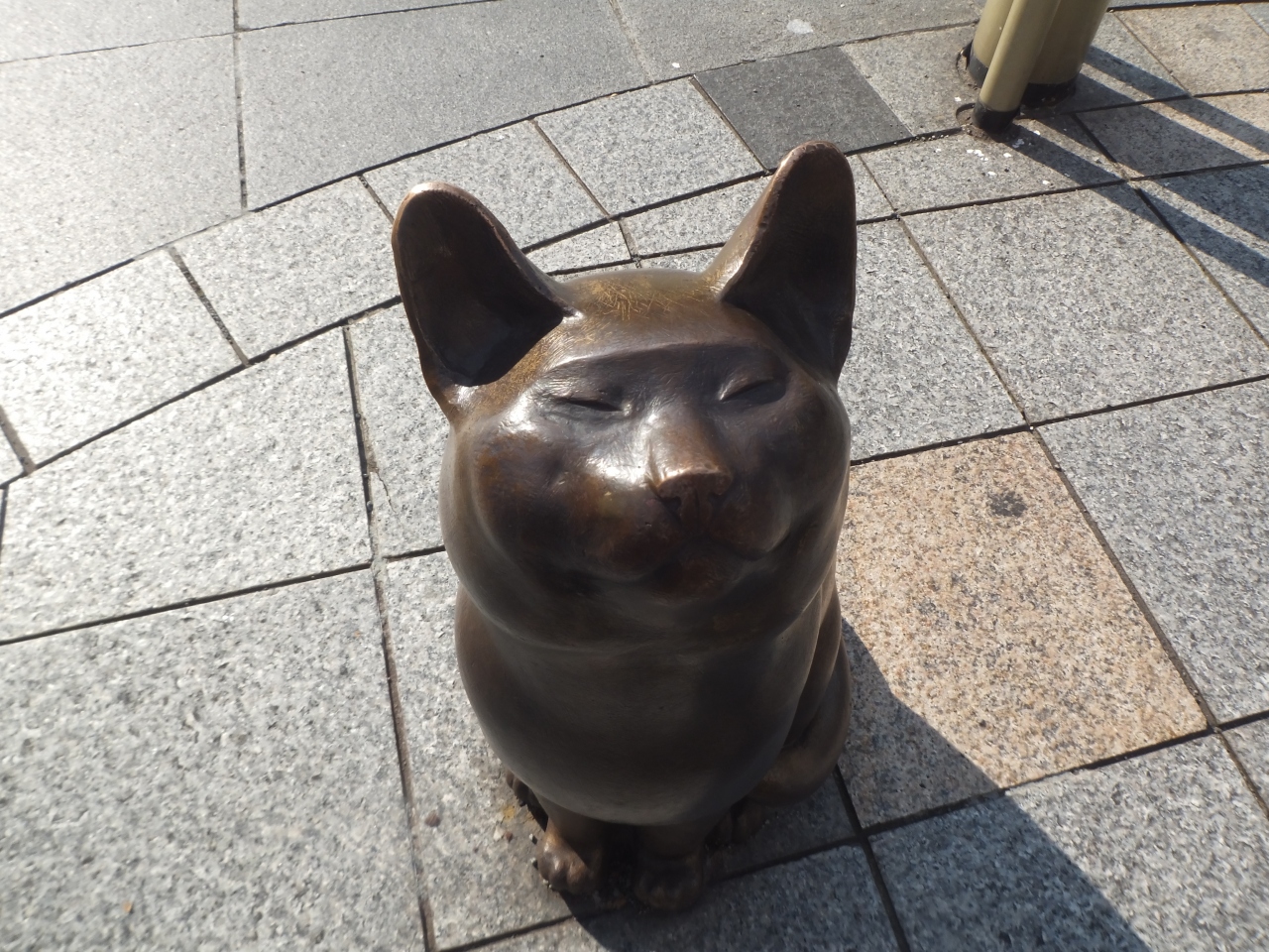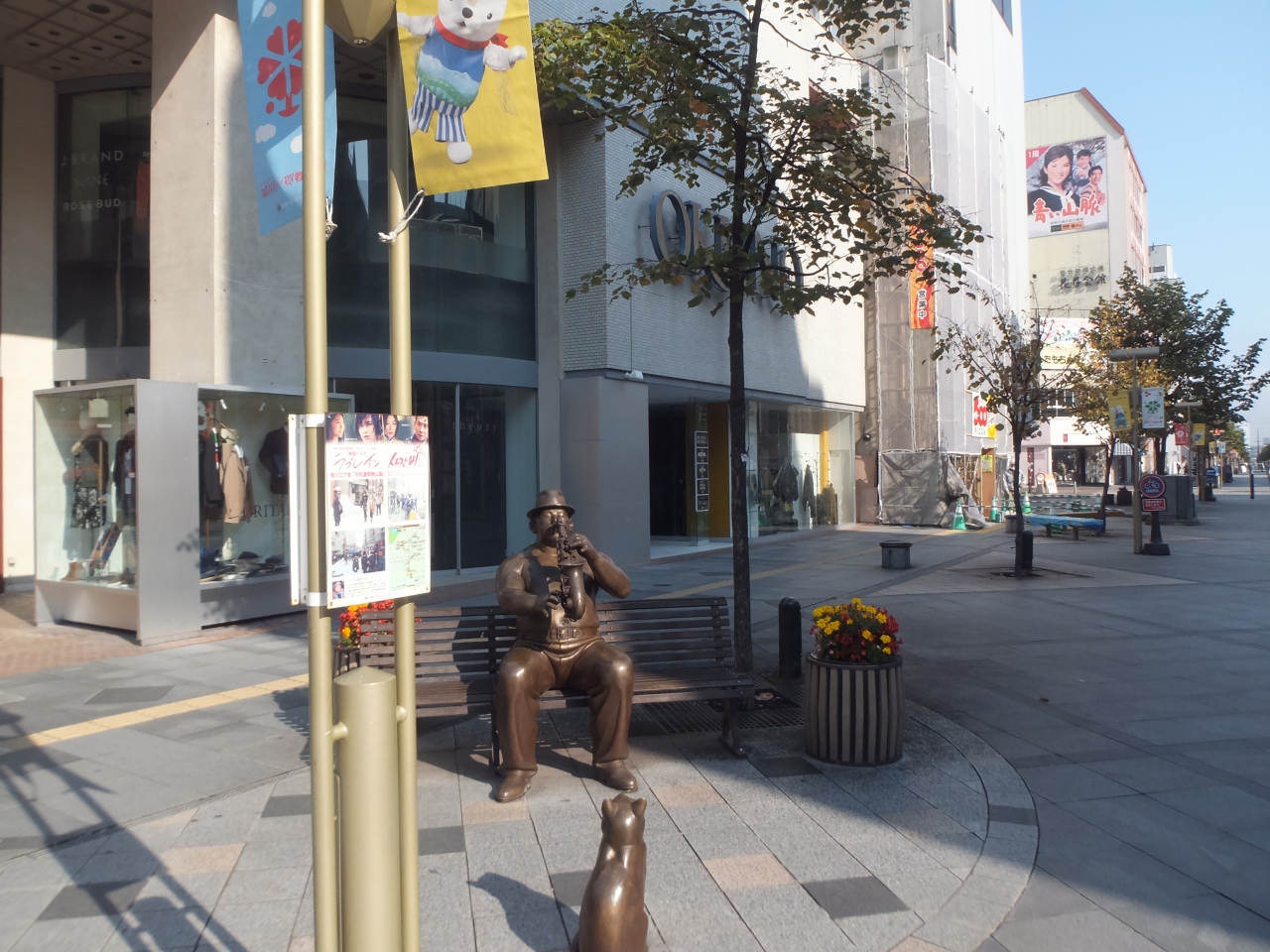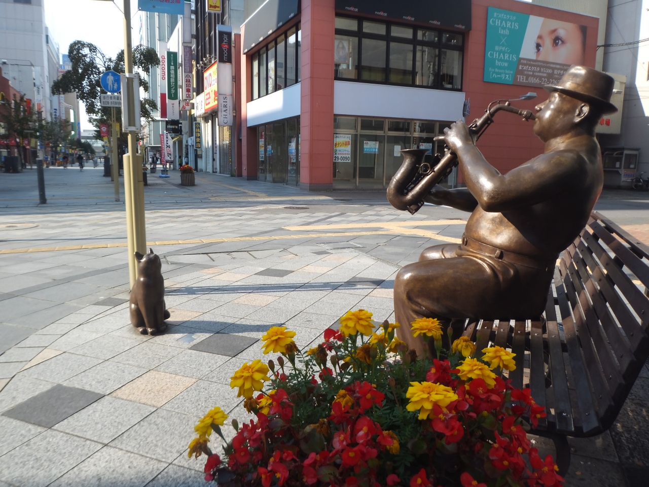 ベンチに座ってサキソフォンを吹く男の様子を猫が見ているという銅像で、一緒にベンチに座って記念撮影をすると、愛嬌のある写真になるかと思います。そういう意味では、体験型の彫刻です。