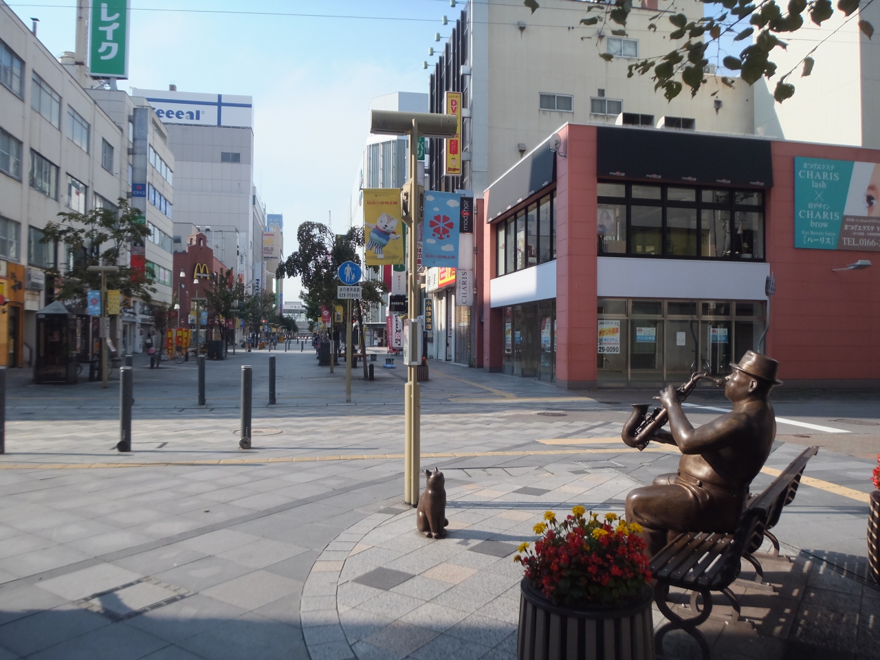 旭川駅前からまっすぐに伸びる通り、平和通買物公園の2・3条仲通りとの交差付近にあります。駅を出て400mほどのところです。